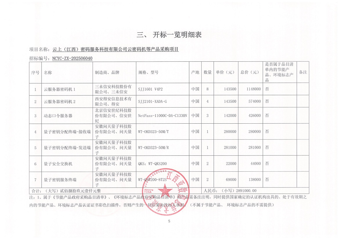 云上(江西)密码服务科技有限公司云密码机等产品采购项目 | 详见开标一览明细表 | 详见开标一览明细表 | 1批 | 2891000.00 |